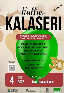 2025 är året när vår förening fyller inte mindre än 30 år. Välkomna på Kulturkalaseri lördag 4 oktober i Österundagården med konserter för alla ådrar och workshops. Fri entré och ni blir bjudna på fika och mat & dryck. För planeringen så se hur ni anmäler er under evenemang. Läs mer under evenemang